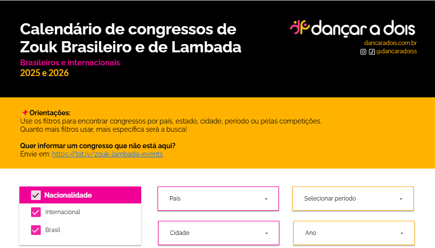 Calendário interativo com congressos brasileiros e internacionais de Zouk Brasileiro e de Lambada